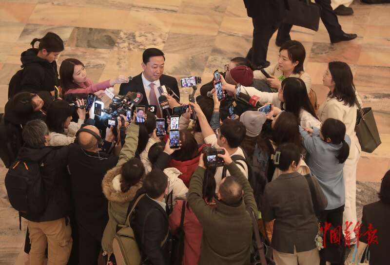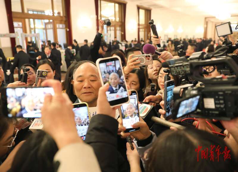 3月4日,北京,人民大会堂,全国政协十四届四次会议开幕会结束后,记者们围住全国政协委员、一心堂药业集团股份有限公司董事长阮鸿献进行采访。中青报·中青网记者 陈剑/摄