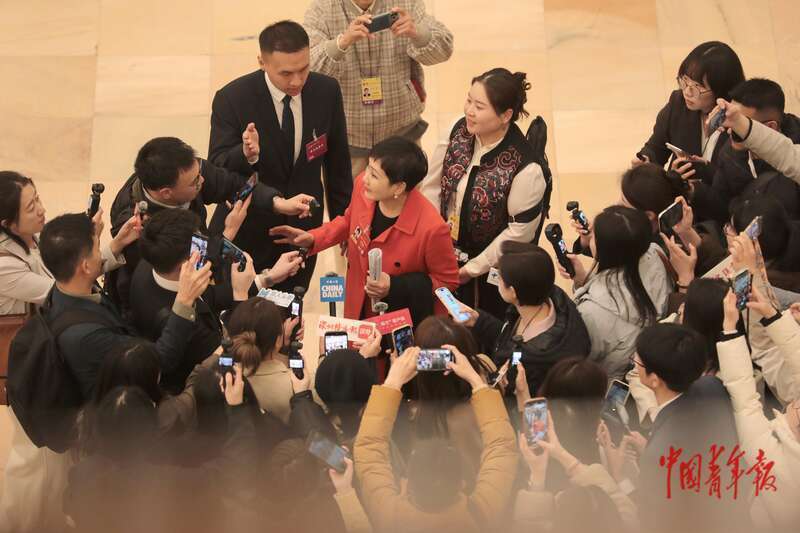 3月4日,北京,人民大会堂,全国政协十四届四次会议开幕会结束后,全国政协委员、演员张凯丽接受记者采访。中青报·中青网记者 陈剑/摄