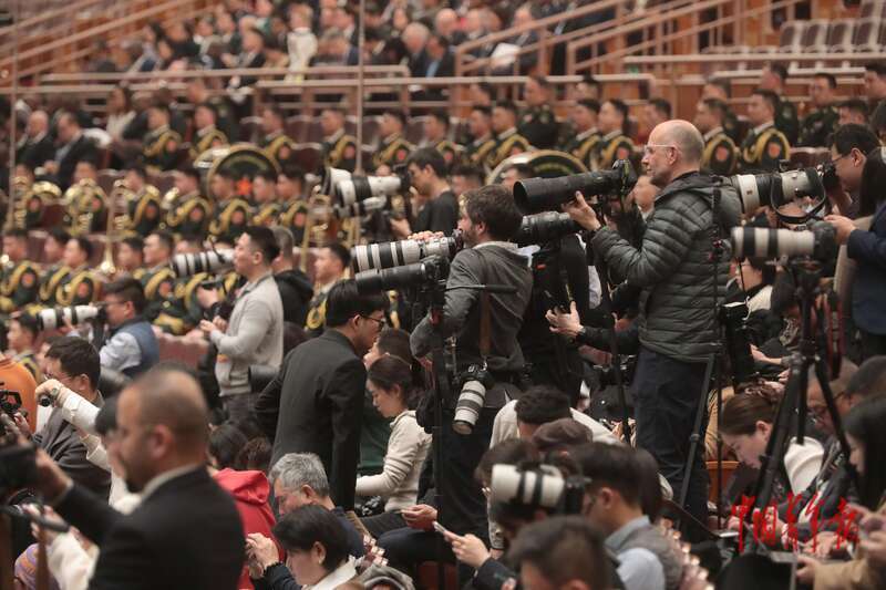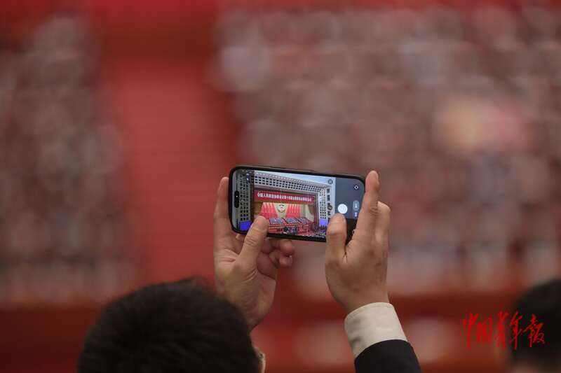 3月4日,北京,人民大会堂,记者用手机拍摄记录全国政协十四届四次会议开幕会现场。中青报·中青网记者 陈剑/摄